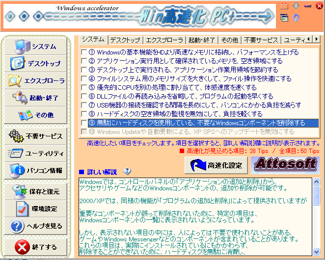 Win高速化PC+はWindowsの設定の変更や不要な機能の停止などを行ってWindowsを高速化するソフトです。 使い方は本体をダウンロードし解凍、起動して高速化したい項目をチェックし高速化設定ボタンをクリックすると高速化されます。バックアップもとれるので安心だと思います。
